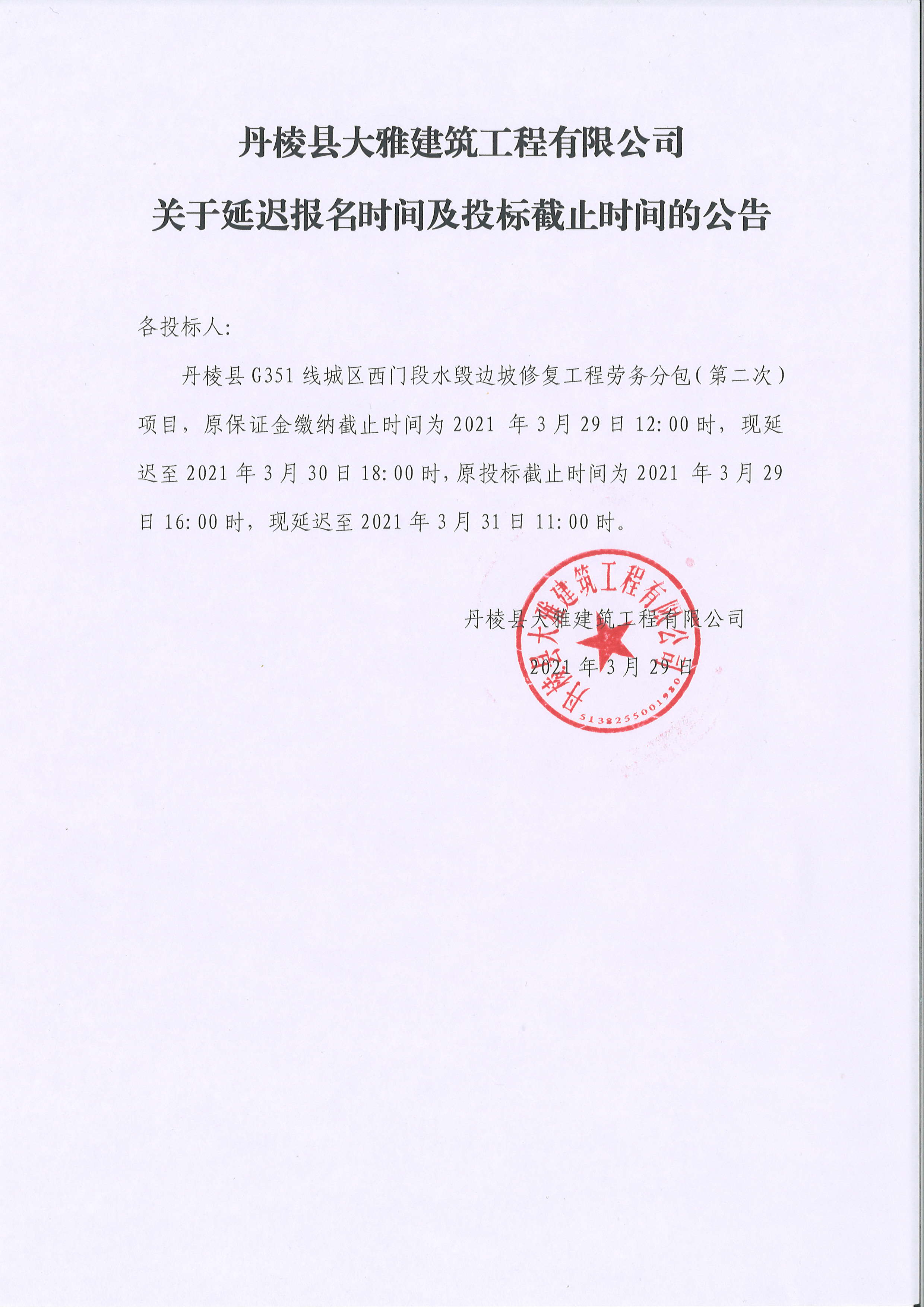 【大雅建筑公司】丹棱縣G351線城區(qū)西門(mén)段水毀邊坡修復(fù)工程勞務(wù)分包(第二次)延遲開(kāi)標(biāo)時(shí)間公告