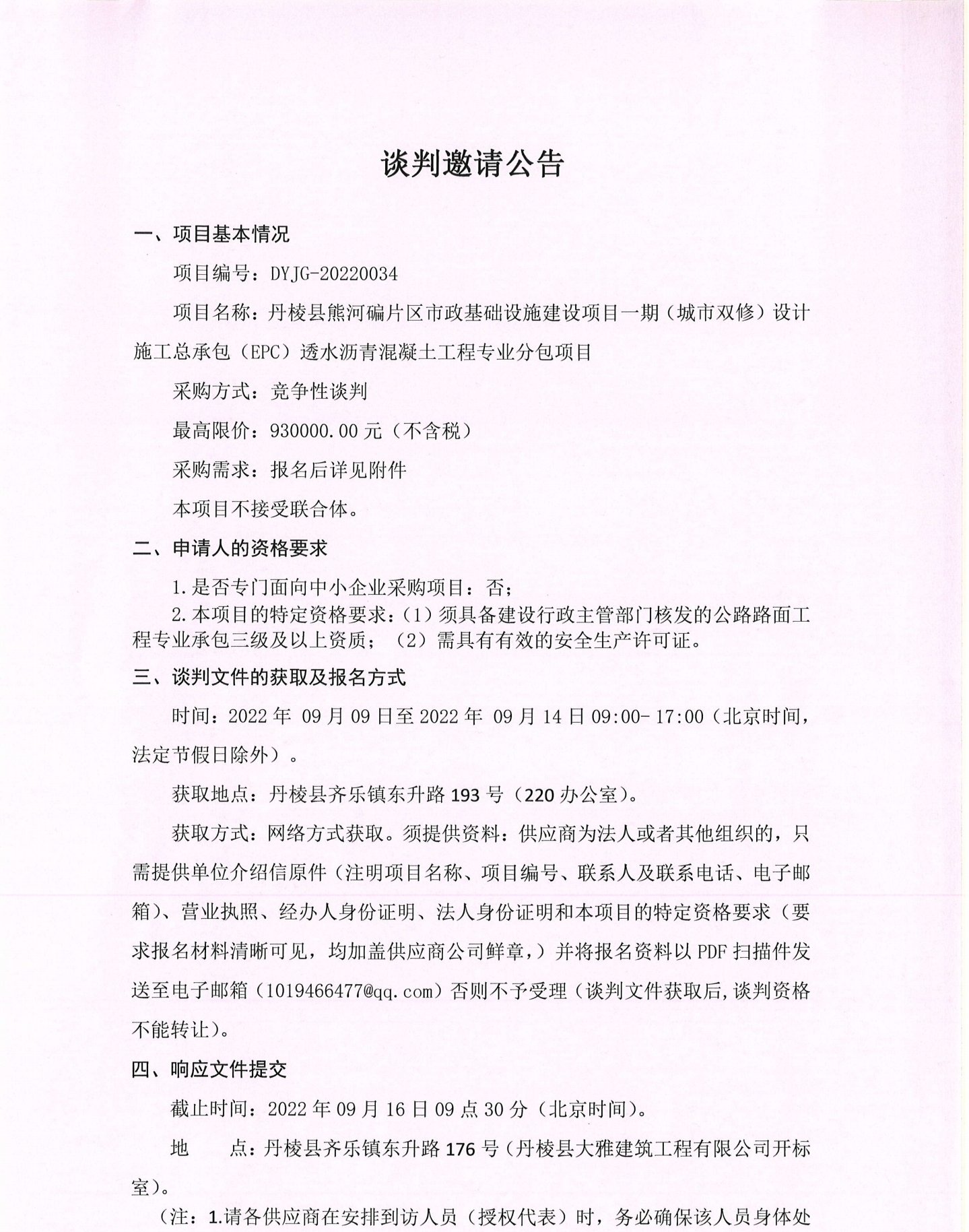 丹棱縣熊河碥片區(qū)市政基礎(chǔ)設(shè)施建設(shè)項(xiàng)目一期(城市雙修)設(shè)計(jì)施工總承包(EPC)透水瀝青混凝土工程專業(yè)分包項(xiàng)目談判邀請公告